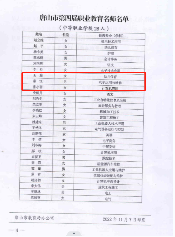 按照市政府《唐山市名师管理办法》(唐政办发〔2020〕8号)和市教育局、市人力资源和社会保障局 《关于组织唐山市第四届职业教育名师申报认定工作的通知》(唐教高职〔2022〕7号)文件精神,全市开展了第四届职业教育名师的认定工作。